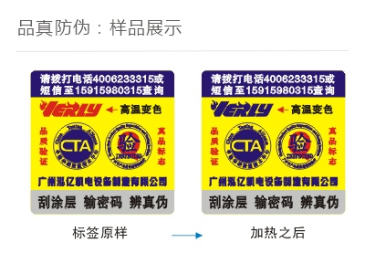 标识的印制由特殊油墨印制而成,其变色基理为油墨在外界温度达到某一温度区间内,油墨内部的化学结构发生变化,从而使标识呈现出不同颜色。鉴别方法可用手、额头触摸标识或轻轻对着呵一口气,或使用高温加热,标识图案发生变化,使用户马上鉴别所购商品的真假。
